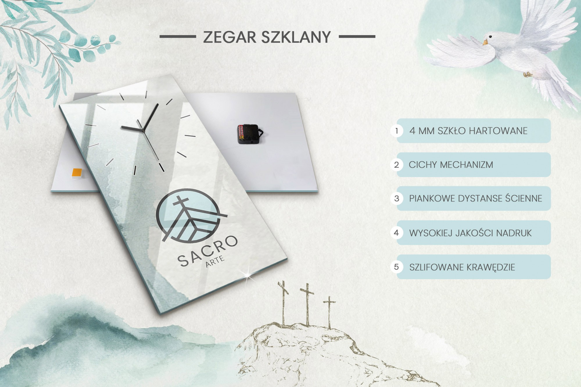 Szklany zegar z motywem Drewniany krzyż i góry idealnie sprawdzi się we wnętrzach urządzonych w nowoczesnym, minimalistycznym stylu, ale z powodzeniem wpasuje się również w bardziej klasyczne aranżacje, wprowadzając do nich powiew świeżości. Jego subtelny design o pionowej orientacji i wymiarach 30 x 60 cm nie dominuje przestrzeni, ale doskonale ją uzupełnia, nadając jej harmonii i stylu. To idealny wybór dla osób, które cenią sobie nie tylko funkcjonalność, ale także estetykę i niepowtarzalny charakter dodatków. Umieszczając go na ścianie, zyskasz duchową dekorację, która przyciągnie uwagę każdego, kto odwiedzi Twój dom.